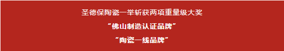 圣德保陶瓷多年來均在眾多品牌激烈競爭中脫穎而出,獲得行業兩會授予多項榮譽獎項,今年再次榮獲大會授予“佛山制造認證品牌”、“陶瓷一線品牌”兩項重量級大獎!