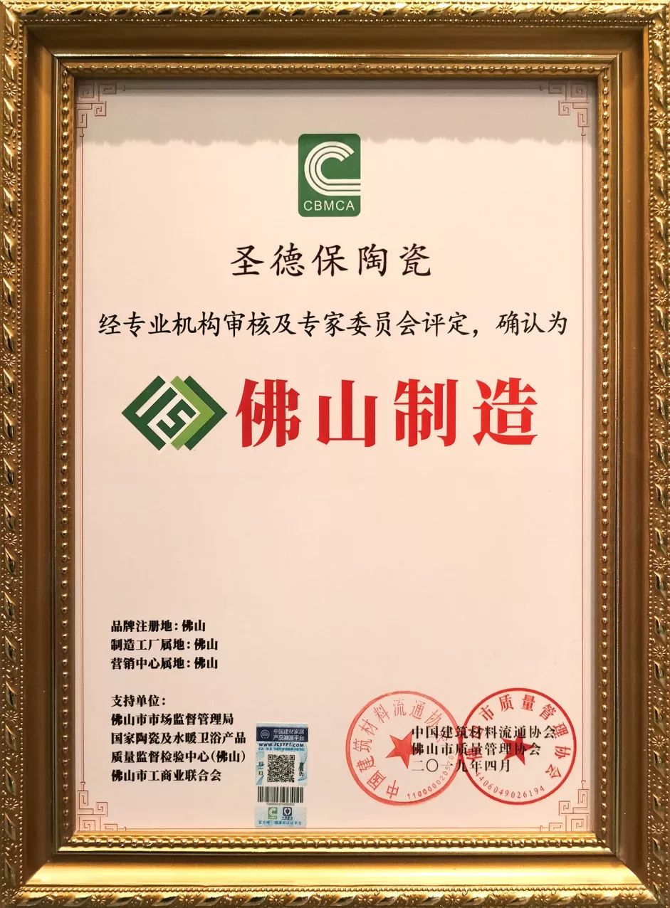 據悉,此次大會通過中國建筑材料流通協會、佛山市質量管理協會的嚴苛審核,評選出佛山本土優秀品牌,作為服務市場20年的圣德保陶瓷,生于佛山,長于佛山,以綠色健康瓷磚為內核,其上乘生產原材料、高級工藝、原創設計的品牌優勢,得到大會一致肯定,被授予“佛山制造認證品牌”,為佛山優秀品牌--圣德保陶瓷正名,更幫助廣大消費者撥云見日,辨別真偽佛山品牌。